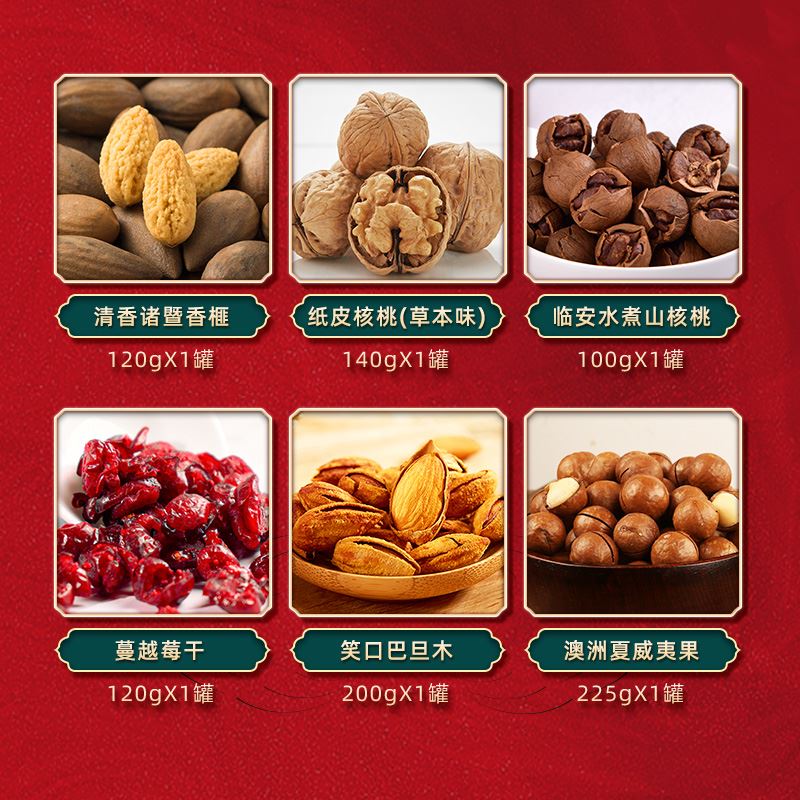 【新农哥】大颗粒诸暨特产香榧120g*1罐 【新农哥】大颗粒临安特产特好剥水煮山核桃100g*1罐 【新农哥】大颗粒蔓越莓干120g*1罐 【新农哥】大颗粒新疆草本味核桃140g*1罐 【新农哥】大颗粒美国笑口巴旦木200g*1罐 【新农哥】大颗粒南非夏威夷果225g*1罐