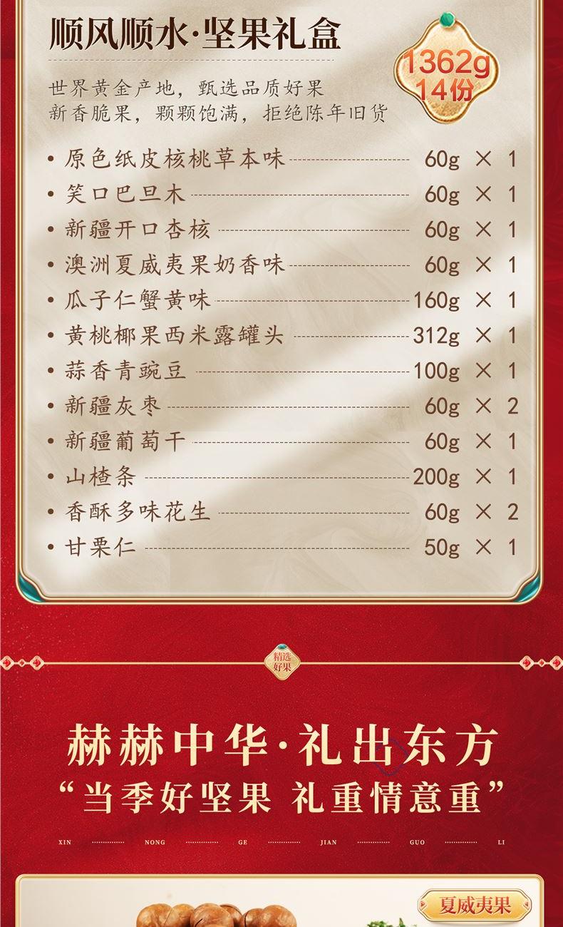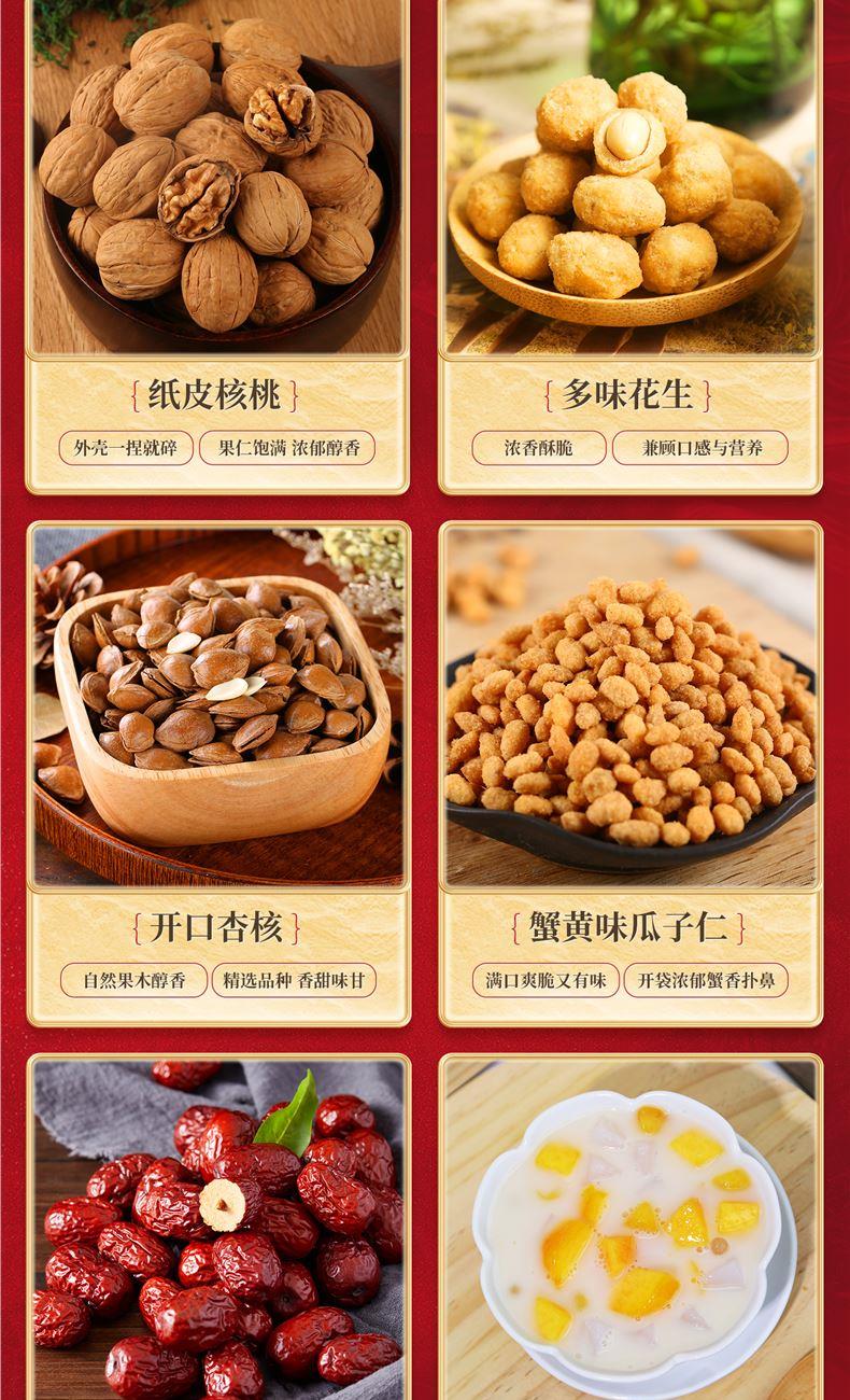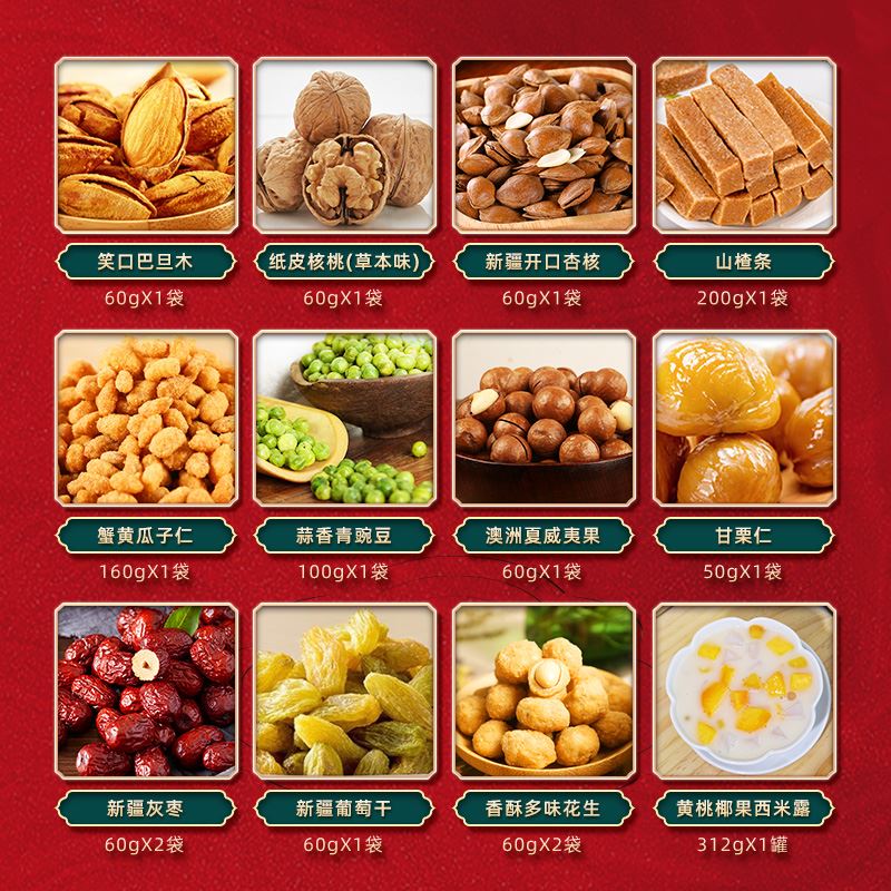 【新农哥】原色纸皮核桃草本味60g*1袋 【新农哥】笑口巴旦木60g*1袋 【新农哥】新疆开口杏核60g*1袋 【新农哥】澳洲夏威夷果奶香味60g*1袋 【新农哥】瓜子仁蟹黄味160g*1袋 【新农哥】黄桃椰果西米露罐头312g*1罐 【新农哥】蒜香青豌豆100g*1袋 【新农哥】新疆灰枣60g*2袋 【新农哥】新疆葡萄干60g*1袋 【新农哥】山楂条200g*1袋 【新农哥】香酥多味花生60g*2袋 【新农哥】甘栗仁50g*1袋