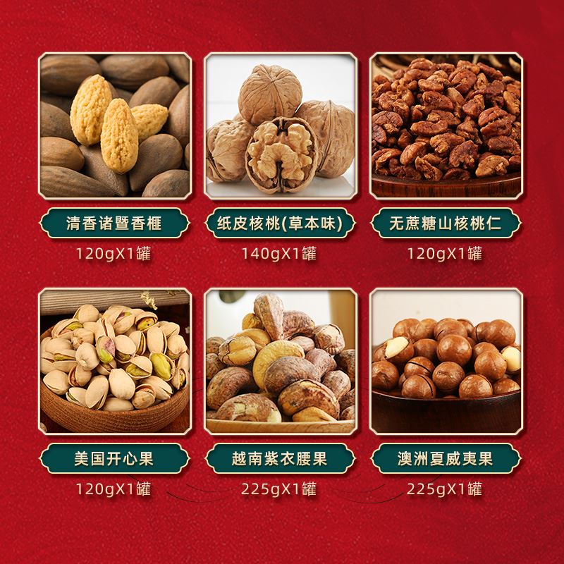 【新农哥】大颗粒诸暨特产香榧120g*1罐 【新农哥】小核桃仁(无蔗糖)小罐120g*1罐 【新农哥】大颗粒美国开心果120g*1罐 【新农哥】大颗粒新疆草本味核桃140g*1罐 【新农哥】大颗粒南非夏威夷果225g*1罐 【新农哥】大颗粒越南紫衣腰果225g*1罐